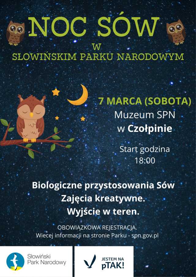 Noc Sów w Słowińskim Parku Narodowym - Muzeum SPN w Czołpinie Czołpino 34, CzołpinoPenetrowanie leśnych ścieżek w mroku nocy może napawać lękiem, lecz przy zbliżającej się pełni Księżyca może okazać się bardzo ekscytujące, ponieważ wielkimi krokami zbliża się jedna z najciekawszych nocy w Polsce. W marcu rozpoczyna się najbardziej aktywny okres w roku dla większości sów. Z tej okazji Słowiński Park Narodowy zaprasza [...]